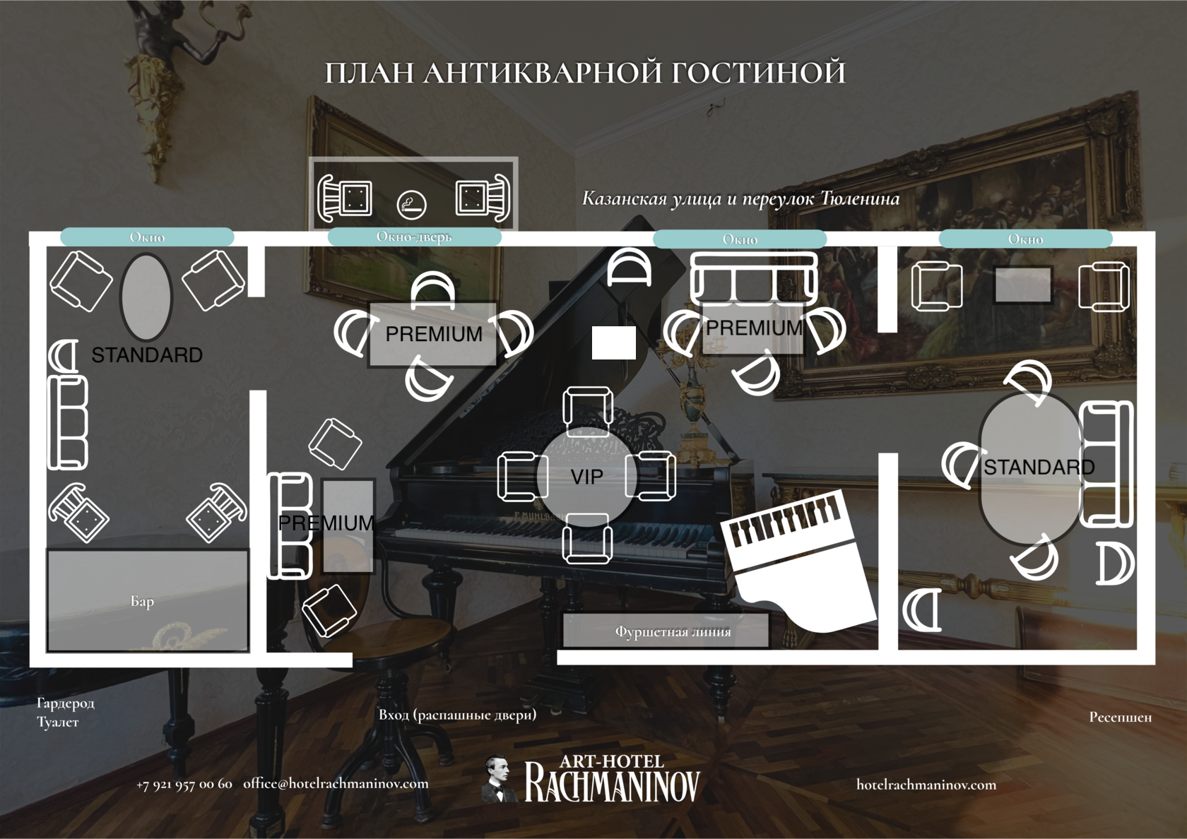 Арт-отель «Рахманинов» вот уже более 20 лет является и настоящим музеем, где собрана великолепная коллекция работ выдающихся художников и фотографов XIX-XXI вв., где постоянно проходят их выставки и различные творческие, музыкальные вечера. В гостиной и во всех номерах находятся тщательно отреставрированные антикварные предметы мебели из частной коллекции, а в комнате, где жил ученик Санкт-Петербургской консерватории в 1882-1885 гг. Сергей Рахманинов у своей тетушки Трубниковой воссоздана обстановка и атмосфера прошедшего века.